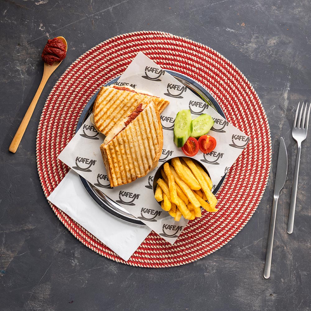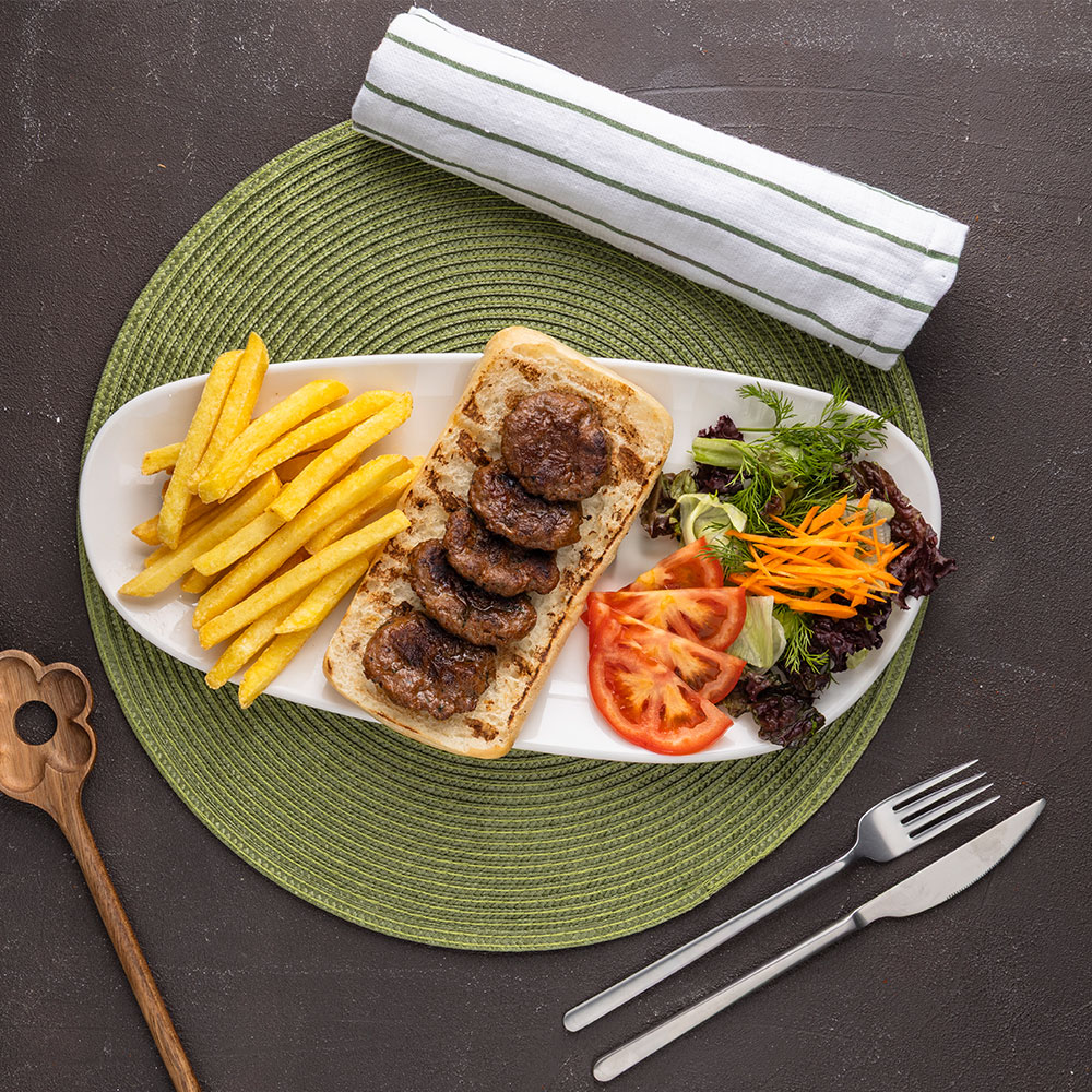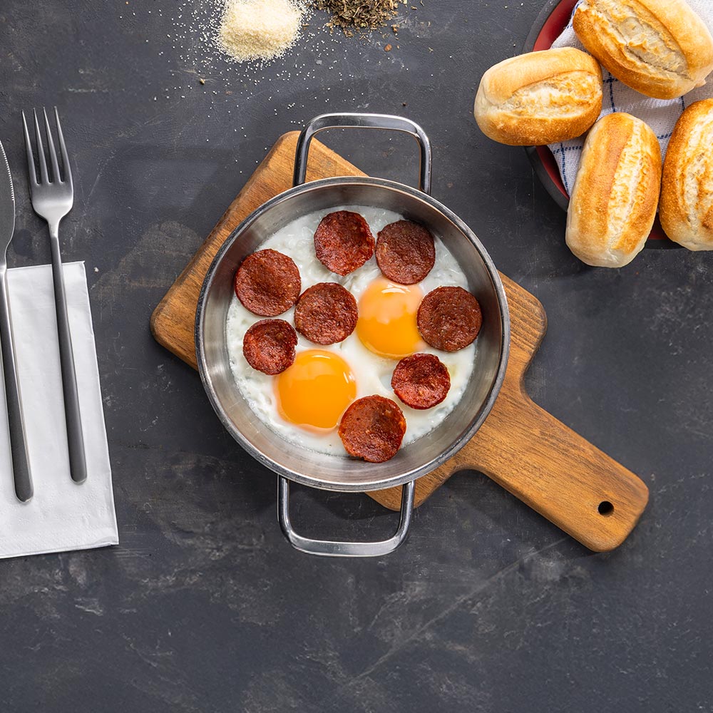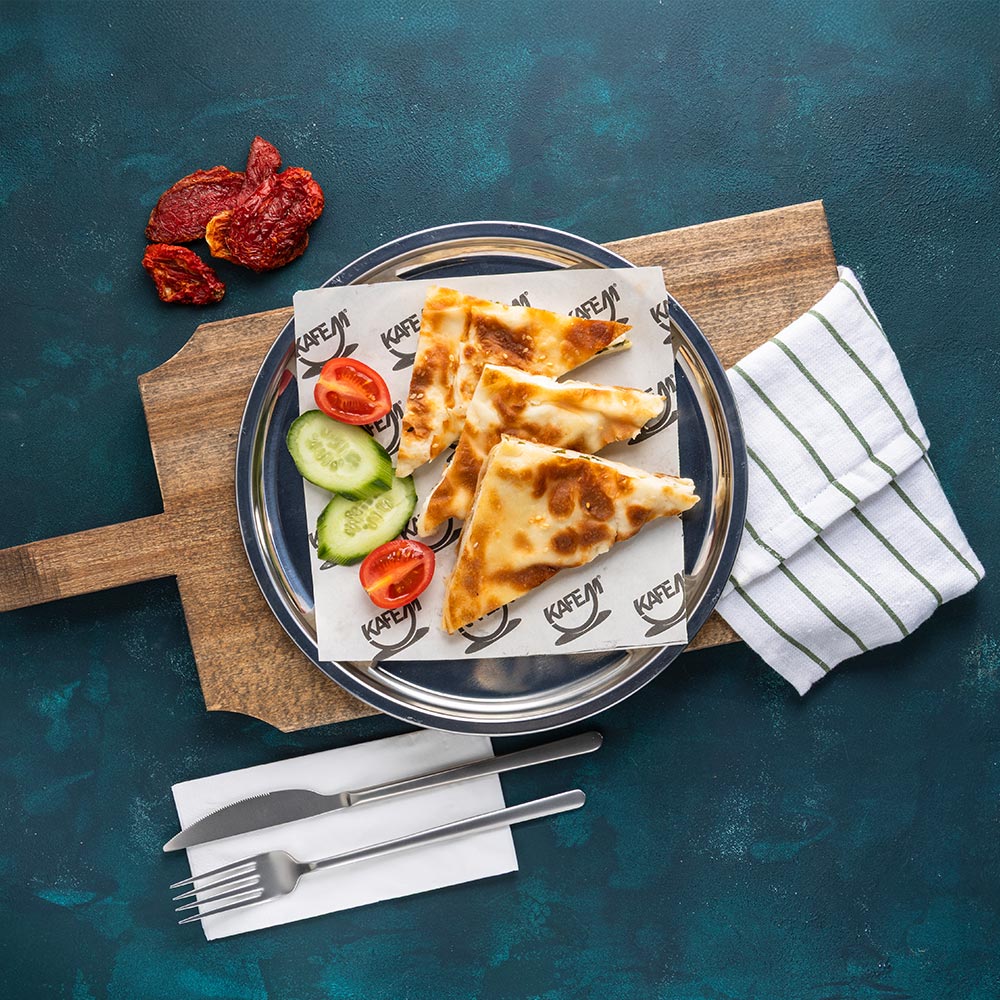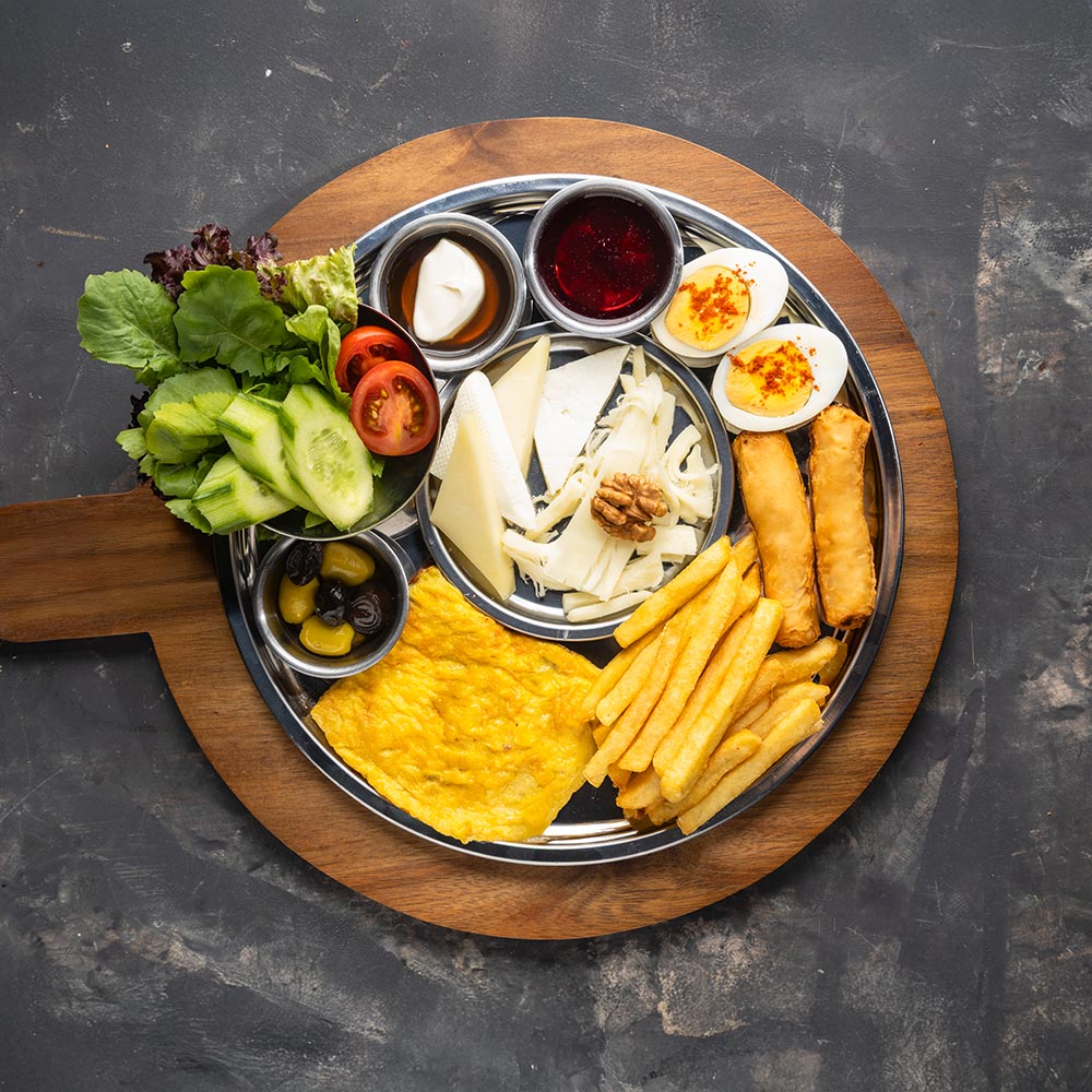 Beyaz Peynir, Kaşar Peyniri, Çeçil Peynir, Ceviz, Siyah Zeytin, Yeşil Zeytin, Bal, Kaymak, Reçel, Haşlanmış Yumurta, Su Böreği, Patates Kızartması, Sucuklu Omlet, Çeri Domates, Salatalık, Taze Yeşillik, Bardak Çay, Baget Ekmek