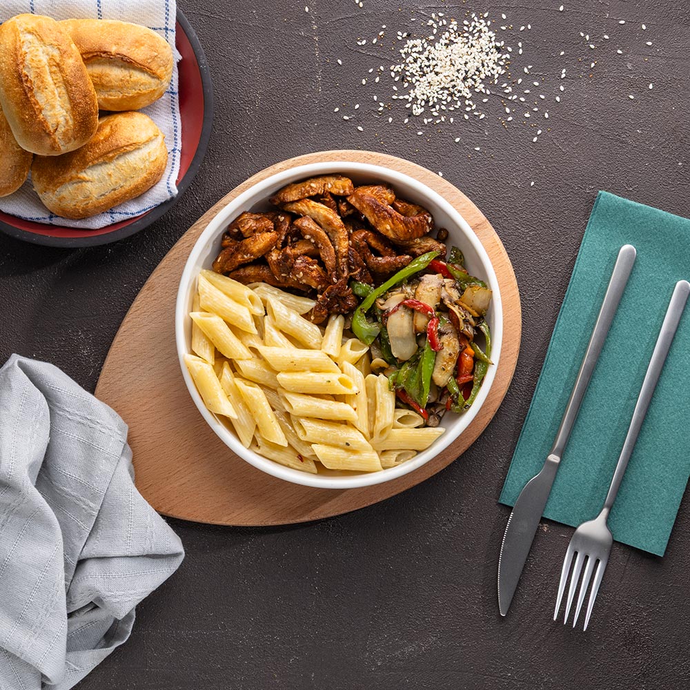 310.00 ₺Tatlı ekşi soslarla harmanlanmış piliç bonfile, Kremalı makarna ve Taze sebzeler. (160 Gr)
