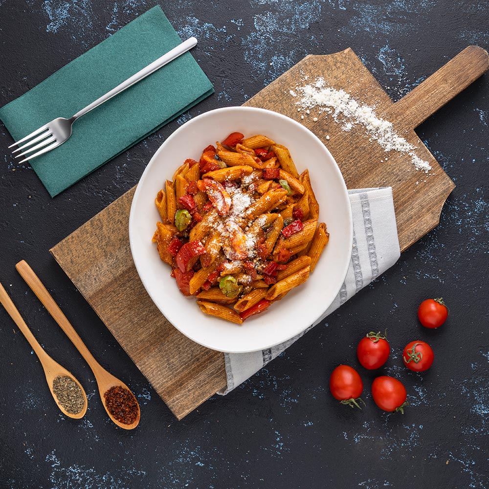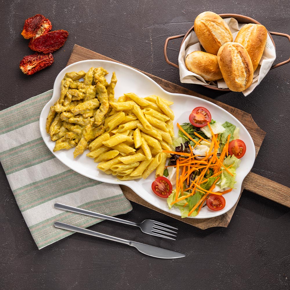 Acı sos ile hazırlanmış piliç bonfile, Kremalı Makarna, Taze sebzeler. (120 Gr)